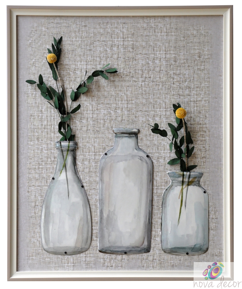 3D метална декорация с цветя в бутилки – индустриален стил и естествена красота в едно. Идеален стенен акцент за хол или кухня.