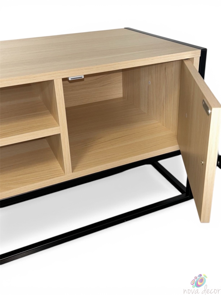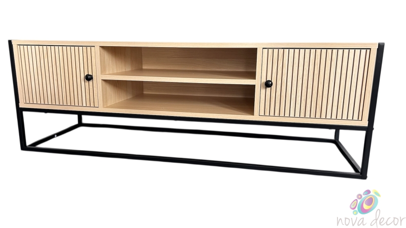Акценти на дизайна: Текстурирани врати: Вертикалните линии тип „жалузи“на двете странични отделения създават интересна визуална динамика и придават на мебелта елегантно излъчване. Отворен център: Двете централни ниши осигуряват лесен достъп и отлична вентилация за мултимедийна техника – игрови конзоли, ТВ приемници или аудио системи. Индустриална основа: Високата черна метална рамка не само придава стабилност, но и позволява лесно почистване под шкафа (подходящо за прахосмукачки-роботи). Естествена визия: Светлият дървесен декор внася топлина и уют, правейки шкафа подходящ за скандинавски, лофт или минималистичен интериор. Технически характеристики: Размери: Дължина 160 см (идеален за телевизори до 65-70 инча). Материал: Висококачествен МДФ, устойчив на надраскване и лесно за поддръжка; прахово боядисана метална основа. Система на затваряне: Врати с елегантни черни дръжки тип „копче“. Цвят: Натурален дъб / Черен мат. Предимства : Организирано пространство: Скрито съхранение за вещи и открити рафтове за декорация или техника. Лесен монтаж: Продуктът се доставя в разглобен вид с подробна инструкция и всички необходими елементи.